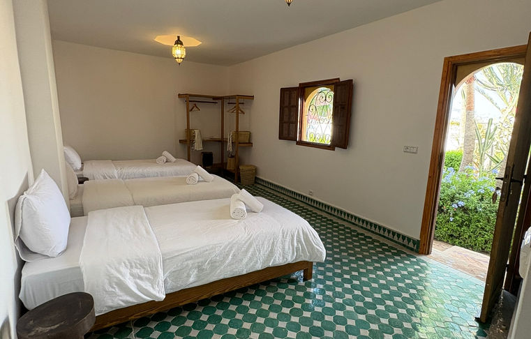 Chambre spacieuse de 20 m² avec 3 lits simples, idéale pour les séjours surf, yoga ou les voyageurs solo. Salle de bain privative attenante. Vue directe sur la piscine, lumière naturelle, esprit sobre et convivial. Accès aux espaces communs : piscine, salon extérieur.